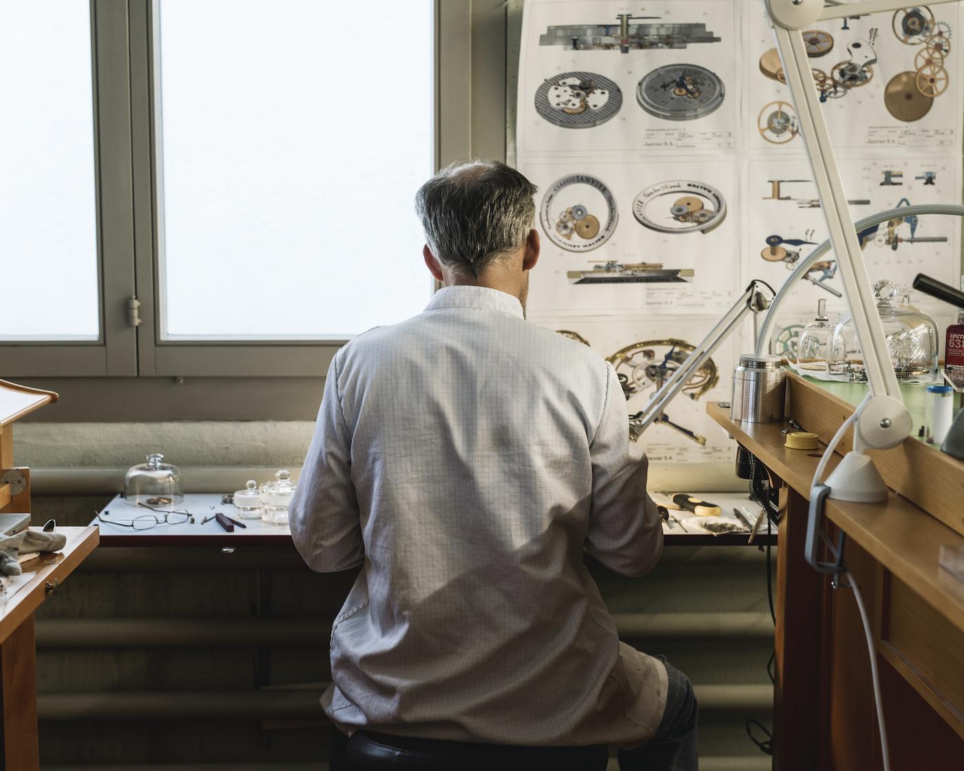 从那之后,他去了一家钟表修复店工作,学到了很多学校之外的技能。一年后,他跳槽去了13区的一个修复腕表的独立制表商。“那里有大量的库存旧货,我就像重新回到了学校。我制作齿轮,切割玉石,制作特殊的零件,如制动杆和复杂的零件。一干就是两年。”