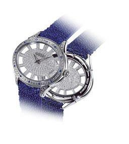 椭圆形不锈钢表。表壳、表盘和后盖镶有429颗钻石和12颗蓝宝石。石英机芯。拱形蓝宝石水晶镜面,防水30米。夜蓝色珍珠鱼皮折扣表带。