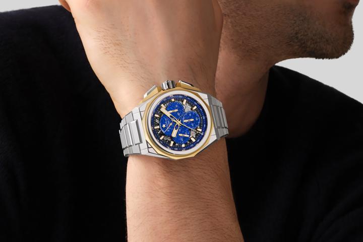 Defy Extreme 挑战极限系列大胆前卫、棱角分明的结构在此新作之中精彩呈现。腕表以镜面抛光不锈钢与温暖的哑光黄金十二边形表圈和按钮护桥形成鲜明对比。绝妙的光影与质感效果,让腕表的立体雕塑造型更显突出,黄金色调延续至指针、时标以及青金石表盘。每只腕表的表盘均是浑然天成的天然艺术品。深蓝色表面上散布闪烁黄铁矿斑点,在每件作品之上呈现出独一无二的纹理。外圈设有蓝色 1/100 秒刻度,与表盘整体形成缤纷和谐的色彩。